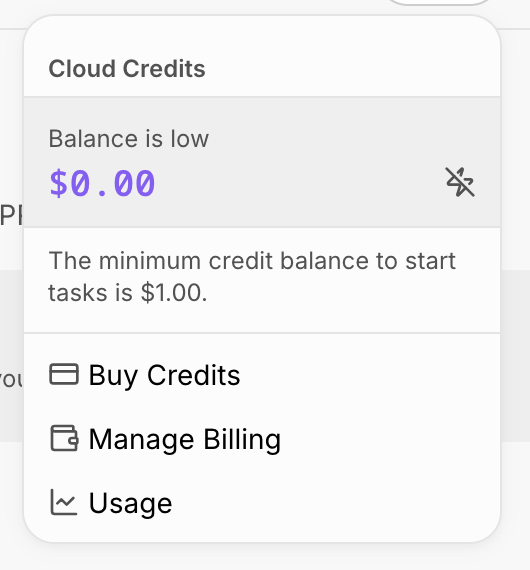 当你注册 Roo Code Cloud 账户时,你会获得一定数量的"免费分钟"来试用产品(你会看到一个可爱的 图标)。这些免费分钟涵盖 Cloud Agent 的运行时间 和 Roo Code Cloud 提供商的推理(这两项通常都需要积分)。这些不能在扩展中使用——它们是让你体验 Cloud 代理魔力的。