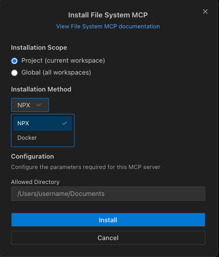 某些 MCP 在安装时需要特定信息,如 API 密钥或 URL。安装这些"参数化"MCP 时,你会被提示: