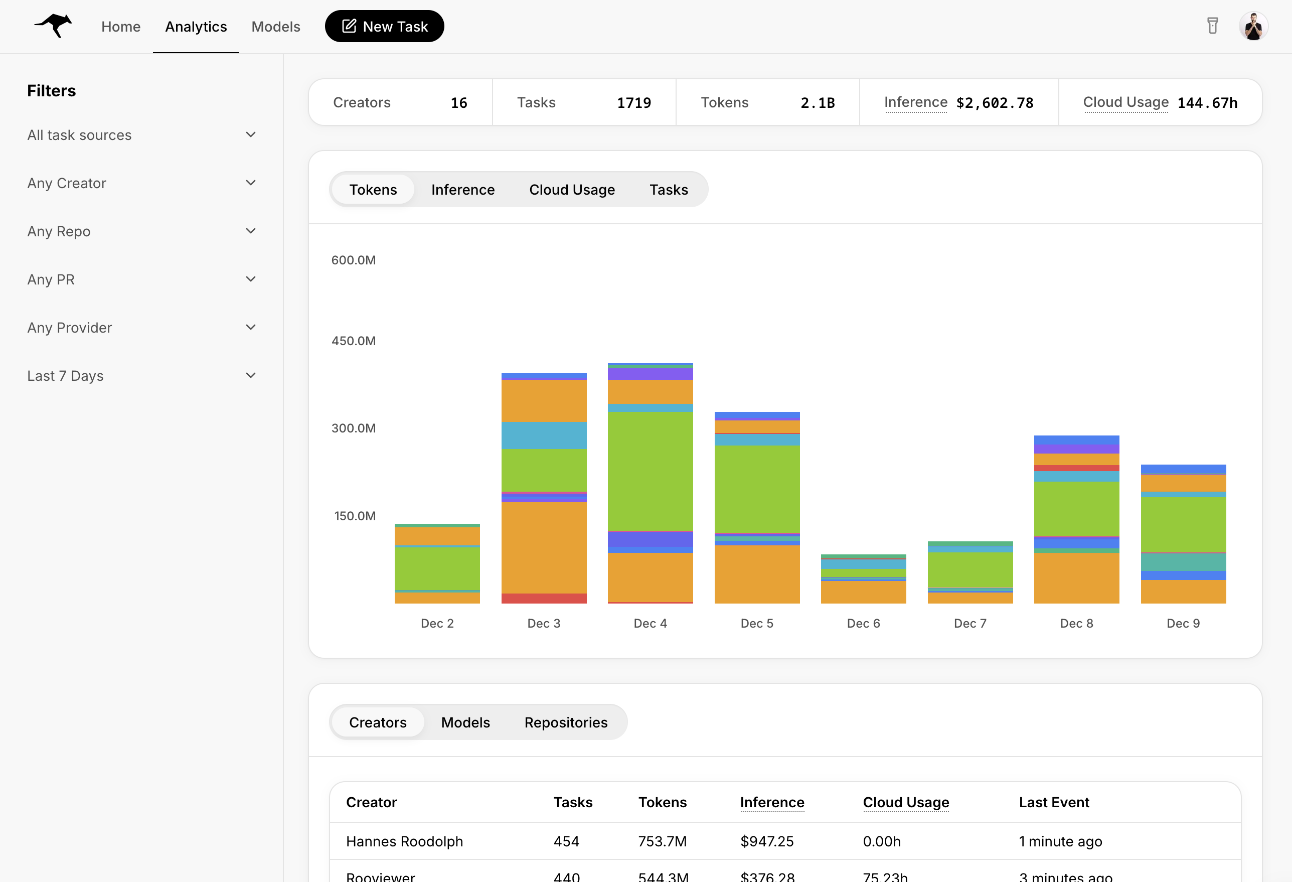Roo Code Cloud 提供全面的分析功能,帮助您了解团队如何使用 AI、优化成本并衡量生产力。