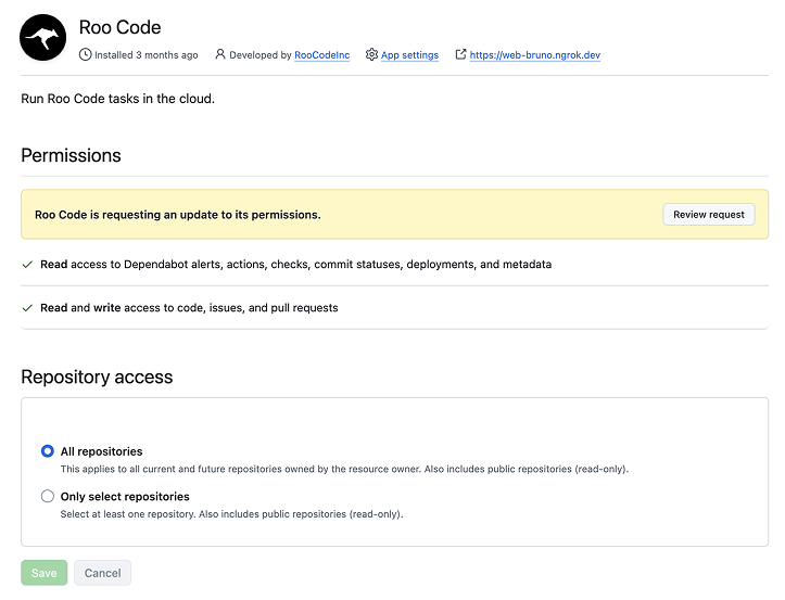 Roo Code Cloud 直接与 GitHub 集成,将你的自主 Cloud Agent 团队引入到你的拉取请求(PR)工作流中。通过安装 Roo Code GitHub App,你可以启用代理创建分支、自动审查代码并修复问题。