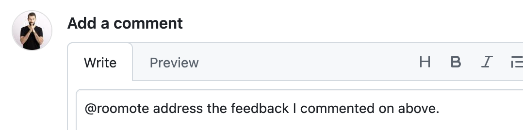 你也可以通过调用 @Roomote 来调用 PR Fixer 代理,以解决 PR 中的任何反馈:
